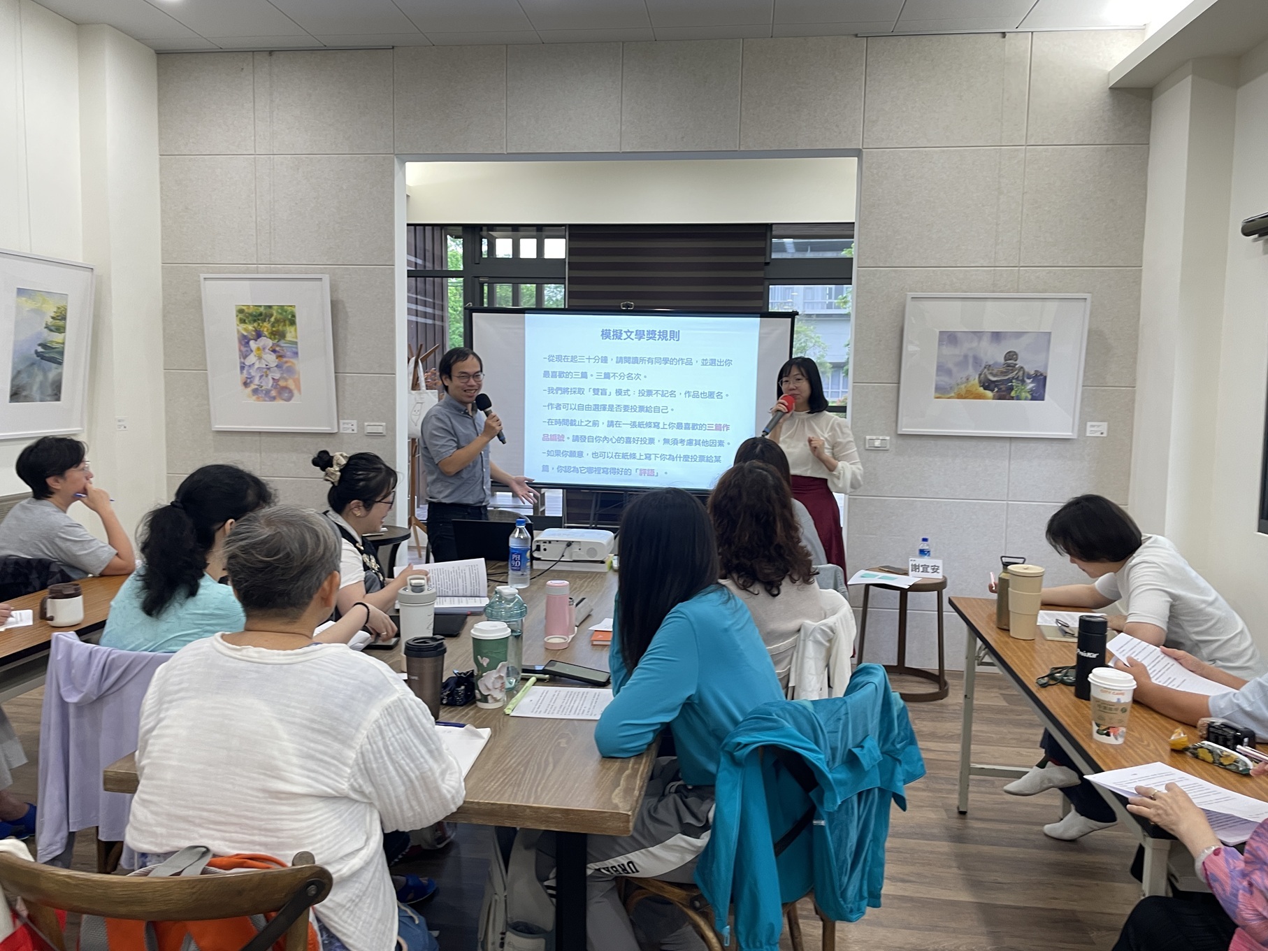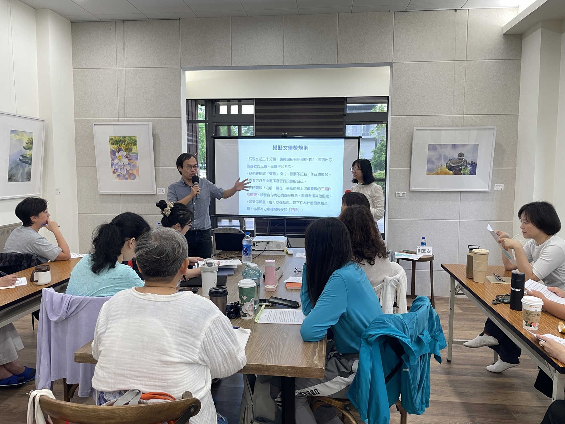 一開始,朱宥勳老師、謝宜安老師 設計了一場別開生面的「模擬文學獎」活動,在30分鐘內閱讀所有同學的作品,並選出自己最喜歡的三篇(不分名次)。