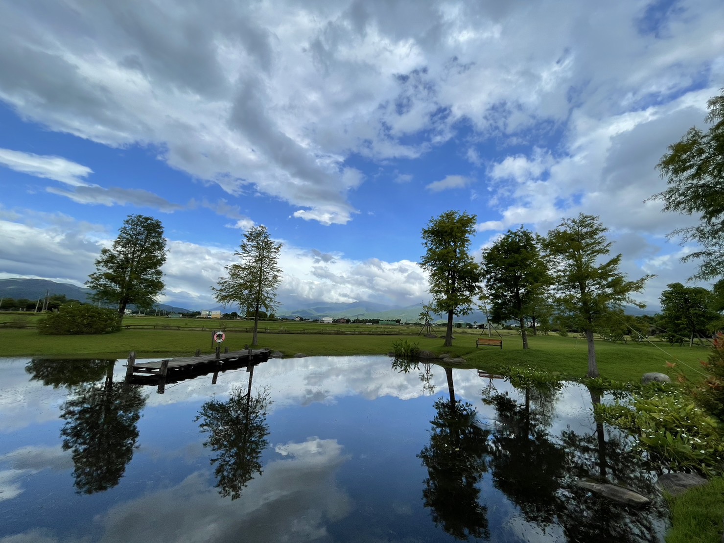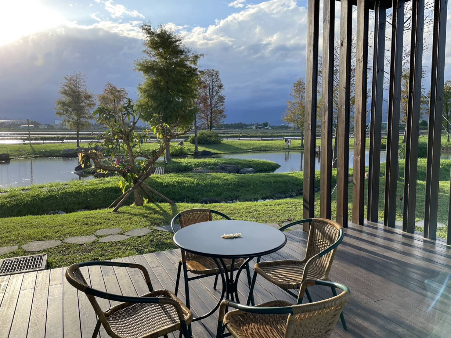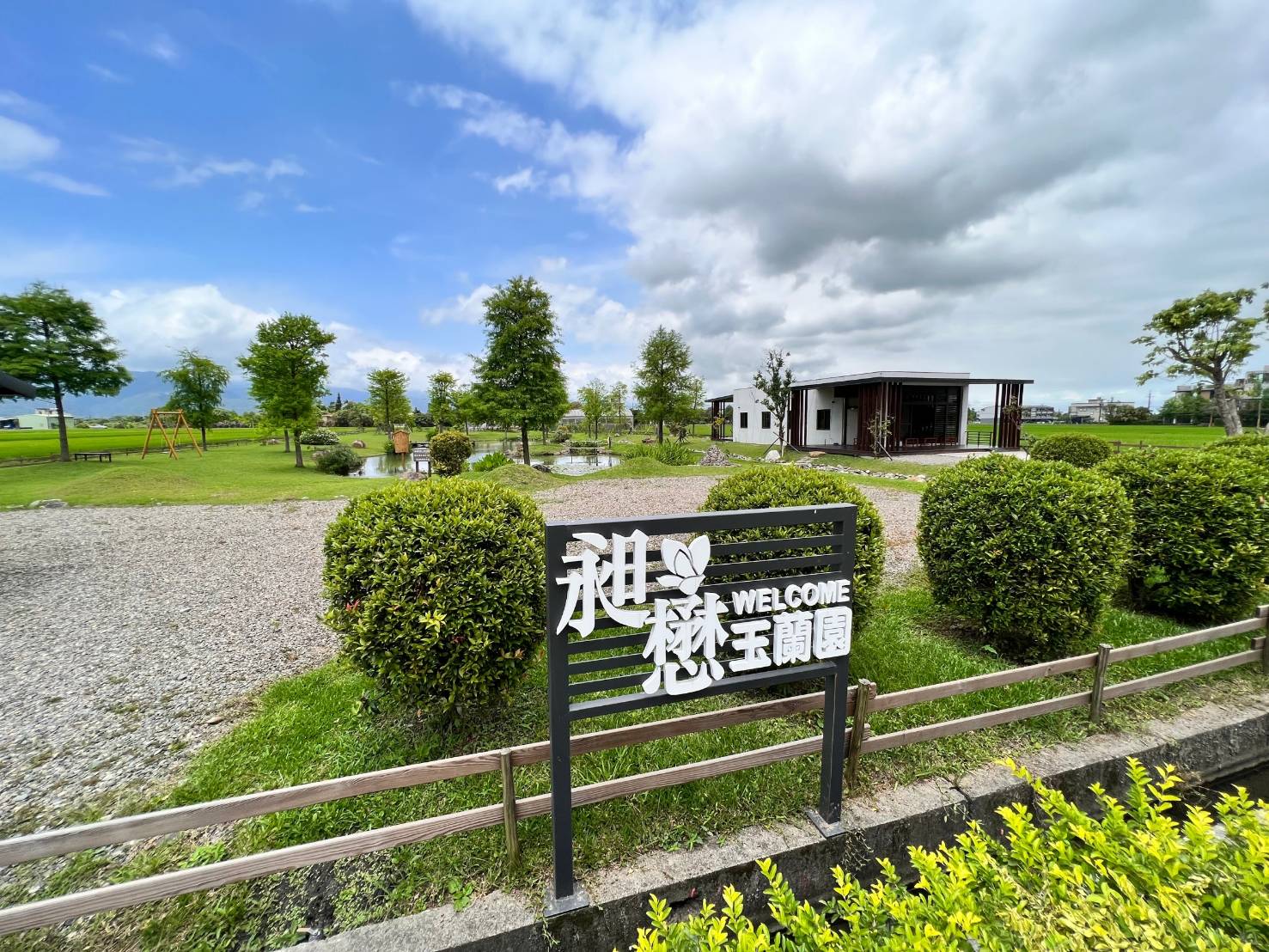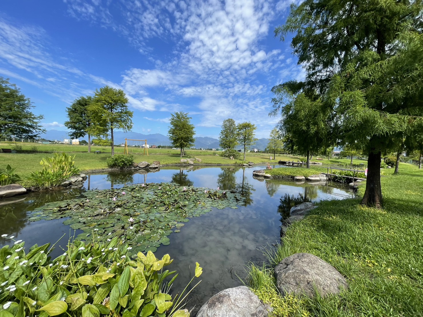 紀念館一出來,正對面發現一片很美的花園「昶懋玉蘭園」。原以為是私人的,後來發現這是座對外開放佔地廣闊的悠靜花園,有蒼勁的落羽松跟池塘,還有孩子最愛的鞦韆,逛了花園一圈,園內周邊有芭樂樹、檸檬樹結實纍纍,池子中睡蓮開得很美,空氣中飄著淡淡的野薑花香,園主說這裡還會有野鴨、白鷺與各種鳥類在這棲息呢!我們坐在涼亭待了一陣子,看著孩子玩鞦韆,望著雪山山脈的美景,好不愜意。