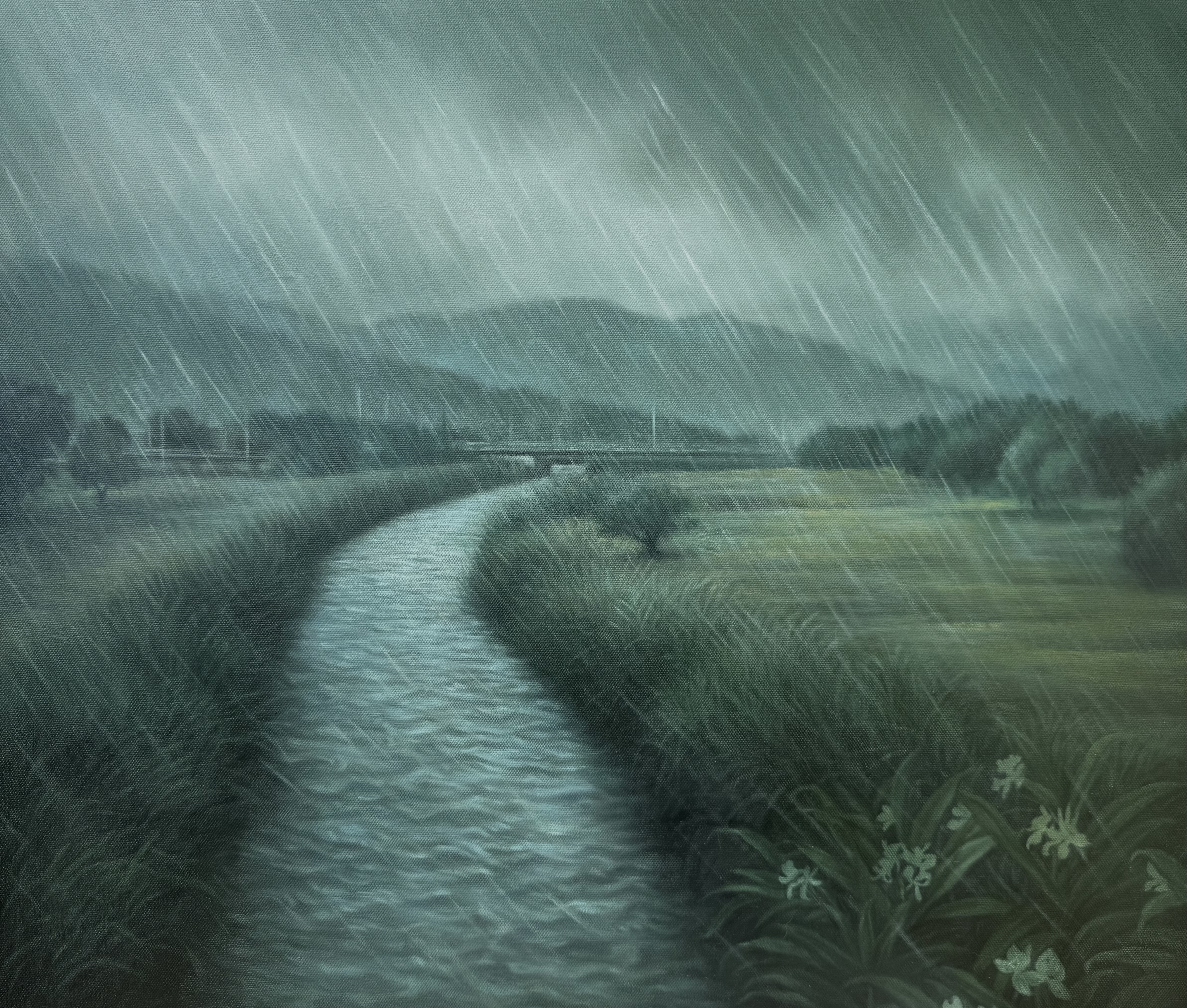 我以灰冷的色調鋪陳這場突如其來的風雨,讓畫布成為時間的斷面,也是一種情緒的容器。畫面中,岸邊的野薑花在風雨中依舊綻放,幽幽地吐露著芬芳。它不與風爭,不懼雨急,只靜靜地存在,彷彿在提醒我:即使在最混濁的時刻,生命仍有其溫柔的堅持。