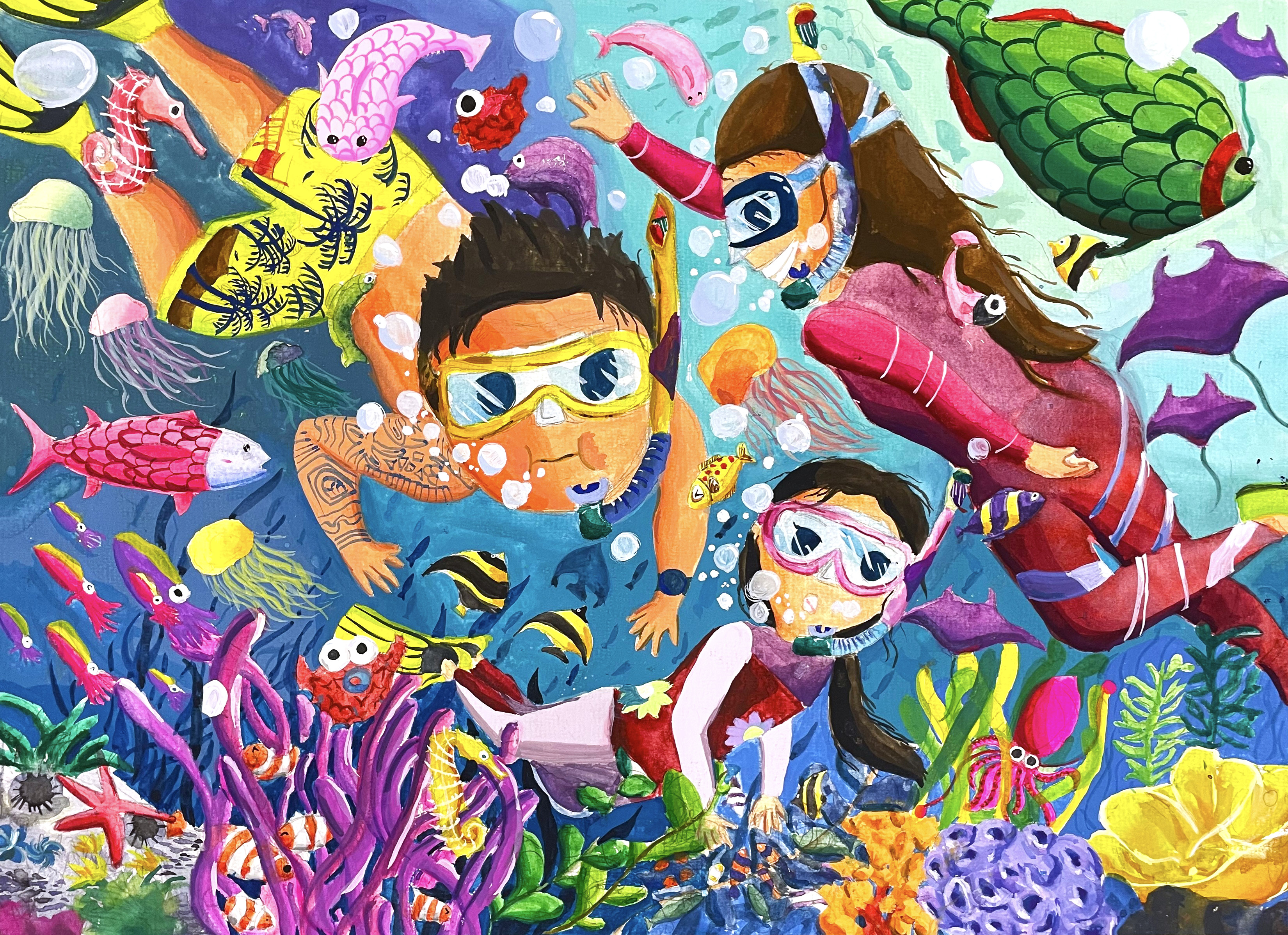 畫作說明:我的家庭熱愛潛水,看到不同的海底生物很快樂。