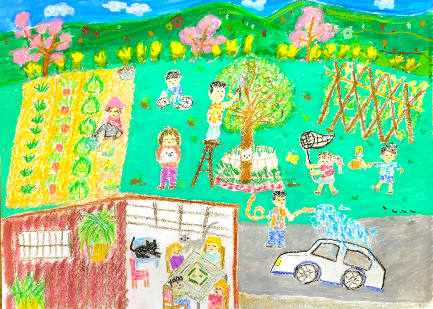 畫面裡,有人在菜園澆水、有人忙著採摘樹上水果、有人在洗車、有小朋友在草地上追逐嬉戲、騎腳踏車,甚至還有人在屋內進行方城之戰,一旁觀戰的灰黑兩隻貓咪的生動表情動作 … 在在都讓人感覺參與其中!畫中人物各自有其不同的肢體動作與服飾配件,共同的是他們臉上都帶著愉快的微笑!